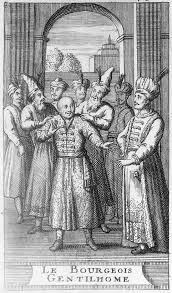 Acte I :M. Jourdain, dont le père s'est enrichi en vendant du drap, a décidé de vivre en " homme de qualité ". L'acte s'ouvre sur la conversation des maîtres de musique et de danse qui discutent des mérites de leur art et jugent avec pitié le parvenu qui les paie. Entrée de M. Jourdain qui montre immédiatement son ignorance et sa fatuité. Entrée du ballet qui forme intermède pour passer au second acte (II).